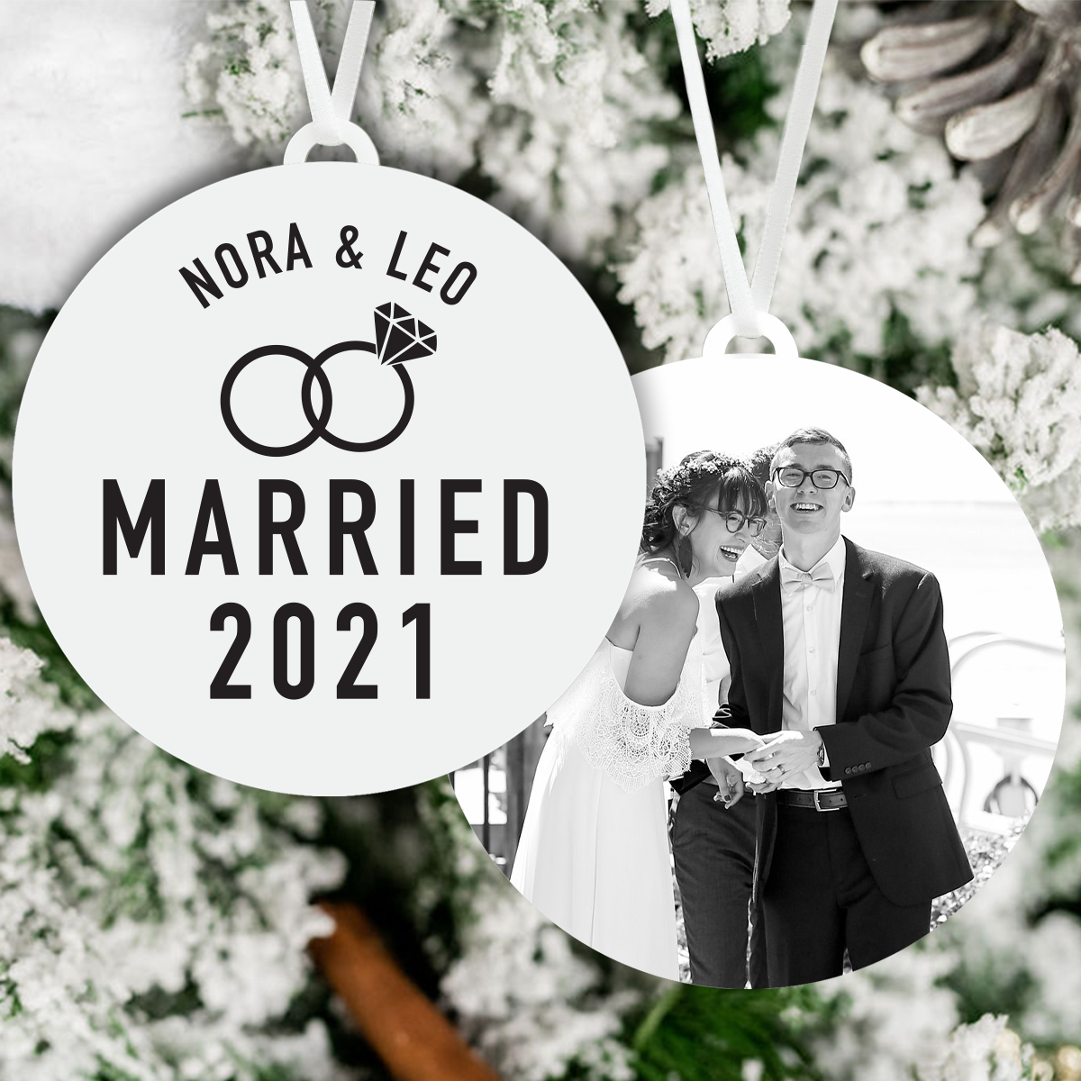 The perfect gift to celebrate your new marriage! This ornament is a great way to commemorate the year you got married. It makes the perfect wedding, anniversary or Christmas gift for your spouse or newlywed friends. Personalize it with the couple's name and the year they got married. You can display this beautiful ornament in your bedroom, home, and on your Christmas tree during the holidays. You can choose to have the design just on the front, add a photo of the couple to the back of the ornament, or make it double sided with the same design on front and back.